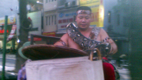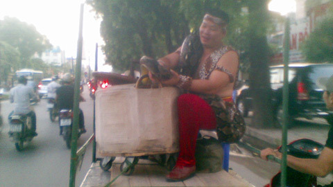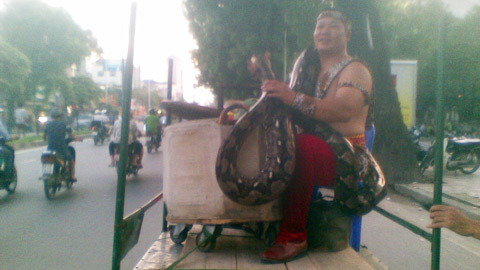 Con trăn to được nhốt trong một cái thùng, đặt lên xe 3 bánh và người diễn viên ngồi trên đó cầm trăn quấn quanh người.