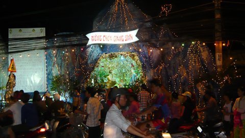 | Tại một xóm đạo tại phường 7, quận 8, đèn nhấp nháy, đèn ngôi sao được chăng suốt hai bên đường. |