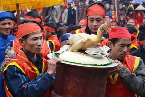 Các thôn đều phải chuẩn bị lễ vật, không thể thiếu trong ngày lễ này là cỗ bánh dày gọi là “Bạch từ bính” và cỗ gà thiến (Cỗ hàn âm) gọi là cỗ ông gà.