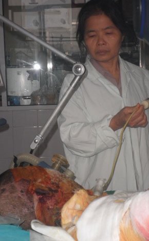 Trên giường bệnh của khoa Hồi sức cấp cứu của Viện bỏng Quốc Gia, Tùng nằm gần như bất động. Phần bập bồng duy nhất cho thấy Tùng còn trên cõi đời là phần bụng và ngực vẫn phập phồng, run rẩy.