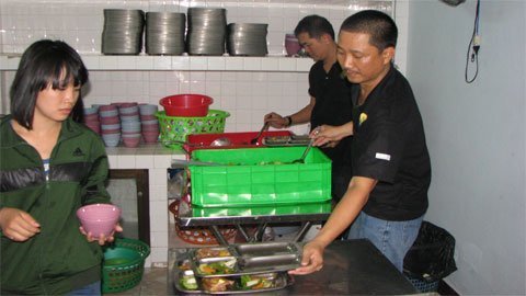 Bắt đầu từ 6 giờ sáng quán cơm đã phải chuẩn bị nấu nướng và đúng 11h15 phút bắt đầu bán cơm. Thực khách cứ xếp hàng lần lượt cứ người này ra thì lại được bổ sung người khác vào.