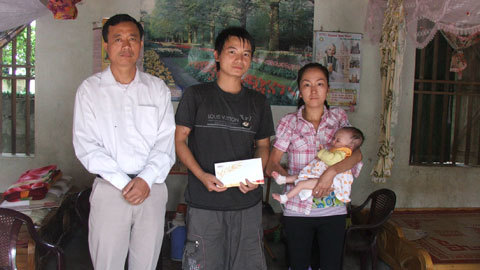 Chính quyền địa phương cùng Báo VietNamNet trao tiền đến gia đình bé Nhi. |