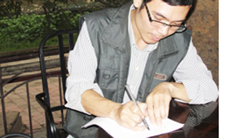 | Mạnh Khởi đang miệt mài với những lá thư tình theo yêu cầu của khách hàng. |
