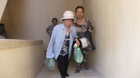 Chị Ánh nhà ở tầng 7 đang có thai ở tháng thứ 6 cực nhọc lê từng bước lên nhà. “Một ngày tôi phải đi lên đi xuống ít nhất 4 lần. Mùa hè nóng bức, tôi cảm thấy mệt mỏi nhừ xương … Quá sợ nhà tái định cư rồi”.