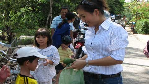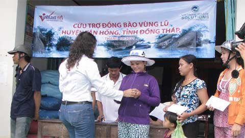 | Đại diện Công ty Xử lý chất thải rắn VN trao quà cho người dân vùng lũ. |