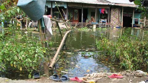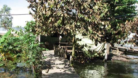 | Ngôi nhà như một ốc đảo người dân bắc cầu khỉ tạm bợ để đi lại. |