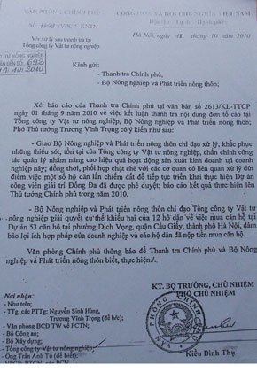 - Giao Bộ Nông nghiệp và PTNT chỉ đạo khắc phục những thiếu sót, tồn tại của Tổng công ty Vật tư Nông nghiệp, chấn chỉnh công tác quản lý nhằm nâng cao hiệu quả của hoạt động sản xuất kinh doanh tại doang nghiệp này. Đồng thời phối hợp chặt chẽ với các cơ quan liên quan để xử lý dứt điểm việc một số hộ dân lấn chiếm đất để tiếp tục triển khai Dự án “Công viên giải trí Đống Đa” đã được phê duyệt, báo cáo kết quả thực hiện lên Thủ tướng chính phủ năm 2010.