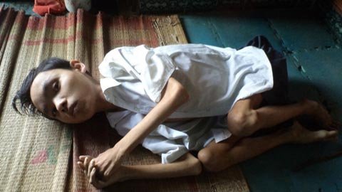 Đến lượt em Đỗ Văn Đức, con trai thứ 3 của vợ chồng chị Nin cũng bị bệnh giống như anh trai ruột của mình. Cách đây 5 năm, em Đức đã không đi lại được. Giờ em đang ngồi một chỗ, các hoạt động chân tay cũng càng ngày càng yếu dần. Khả năng rất cao là trong vài năm tới cũng sẽ nằm một chỗ như em Nguyên.