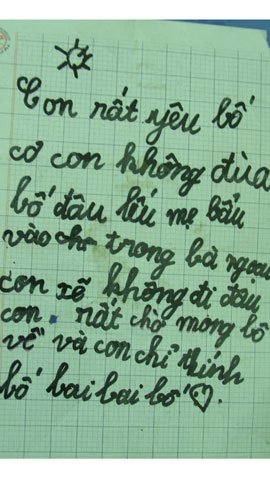 | Thư con nhỏ viết “Con chỉ thích bố…” Một người tốt bụng đã ép dẻo là thư để bảo quản và đặt ở chỗ anh Quê để nhắc anh nhớ đến con nhỏ mà cố gắng |