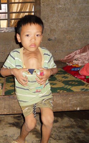 | Em Đinh Hồng Công bị khối u làm trướng ngực, lưng còng, đi lại khó khăn. Đã 13 tuổi mà nặng chưa đầy 20 kg. Cứ trái gió trở trời là em năm thở phì phò |