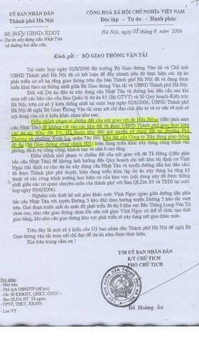 | Văn bản số: 3453/UBND-XDĐT, ngày 08/08/2006 với nội dung: “điều chỉnh phạm vi chiếm đất của nút giao đê Hữu Hồng (đầu phía nam cầu Nhật Tân) để không cắt vào khu đất … D1, D3 thuộc khu đấu giá quyền sử dụng đất”. |