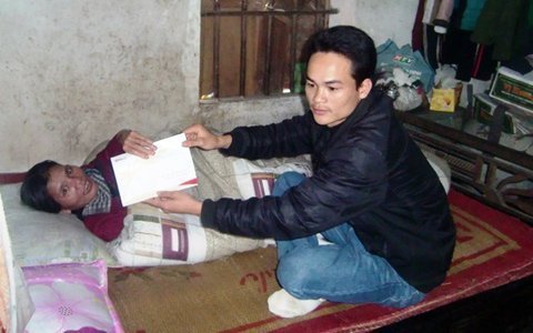 Nằm trên giường, đón nhận số tiền hơn 4 triệu đồng từ đại diện báo VietNamNet, chị Thìn ánh mắt rạng ngời, liên tục gật đầu. Chị chẳng thể nói nhưng nhìn những giọt nước mắt trên khoé mắt chị chúng tôi hiểu được niềm vui mừng của chị khi đón nhận tấm lòng thơm thảo từ bạn đọc.