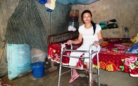 | Chị Hoa sau tai nạn không đi lại được. Chiếc xe chống là phương tiện mà chị đang gắng tập để hi vọng có thể chập chững đi lại |