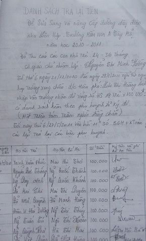 Đơn thư phản ánh của cô giáo Hồng còn cung cấp bằng chứng về việc Trường mầm non Tây Mỗ A thu nhiều khoản thu vô lý của học sinh như: Tiền mua xăng, tiền mua dây điện, phụ phí … Nhiều phụ huynh thắc mắc về những khoản tiền vô lý này, sau này khi phụ huynh thắc mắc, thì nhà trường có biên bản trả lại tiền mua dây điện cho phụ huynh.