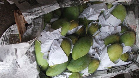Theo quan sát của chúng tôi, các gói bột màu trắng, sờ mịn mịn như bột gạo, được bọc một lớp báo vứt tung tóe ở ngoài chợ quanh ki-ốt bán xoài, khi được hỏi về gói đất này, một người chuyên gánh thuê tại chợ Long Biên nói: “Đó là gói đất đèn, các chủ buôn ở đây dùng để “đánh” xoài cho nhanh chín. Xoài đánh bằng đất đèn, quả nào quả ấy cũng giống nhau như đúc, vàng đều như rơm, trông rất bắt mắt”.