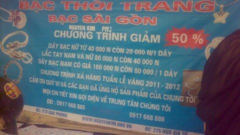 Thắc mắc về giá rẻ bất thường, chủ sạp hàng giải thích: “Chẳng qua nó nằm trong diện bị lỗi do Công ty Vàng bạc đá quý Nguyễn Kim và PNJ tay nghề non, đánh lỗi hơn 500 sản phẩm nên phải phát hành giảm giá 50% để chúng tôi thu hồi sản phẩm về. Nếu không thế thì bạn cứ đi cả đất Hà Nội này cũng không có chỗ nào bán dây bạc dưới 100 nghìn đồng/ dây như vậy”.