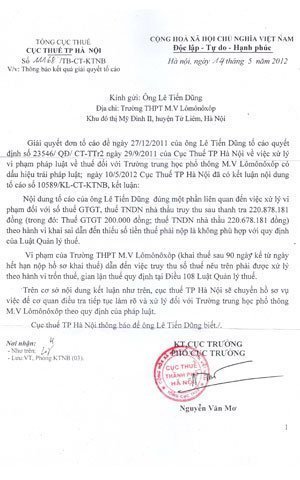 Ngày 18/01/2012, Cục thuế TP Hà Nội cũng có Văn bản 1097/TB-KTNB gửi ông Dũng về việc thụ lý giải quyết đơn tố cáo của ông với nội dung “xử lý về thuế đối với Trường THPT M.V.Lômônôxốp có dấu hiệu trái pháp luật”.