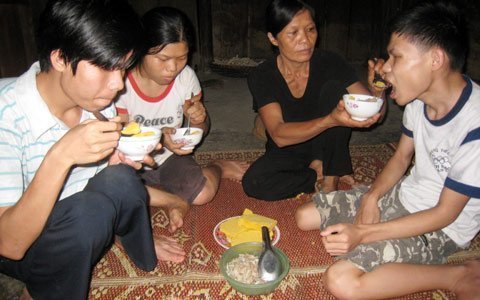 Vừa đút những miếng bồi khô khan cho đứa con bị mù, chị Điến vừa cho biết, gia đình chị thuộc nơi rốn lũ, đất canh tác rất ít, chỉ trồng được ít ngô, lạc. Còn lúa thì hầu như nhà chỉ được vài sào đất nên phải đong gạo triền miên. Bồi là món ăn xen kẽ cho đỡ tốn gạo.