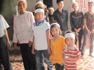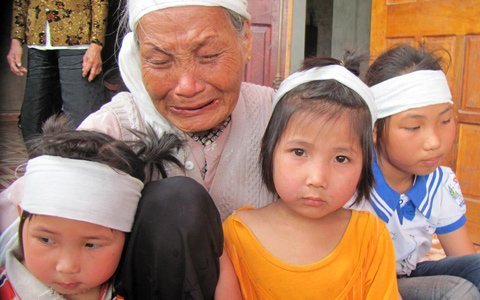 Thắp nén nhang cho người quá cố, chúng tôi không cầm được nước mắt khi nhận được những cái lạy tạ lễ của bà cụ hốc hác, khô cạn nước mắt Hoàng Thị Lan (78 tuổi) cùng 3 cháu nhỏ thơ ngây, cháu Hoàng Thị Phương (11 tuổi), Hoàng Thị Hoa (5 tuổi) và bé út Hoàng Thị Huệ (hơn 2 tuổi).