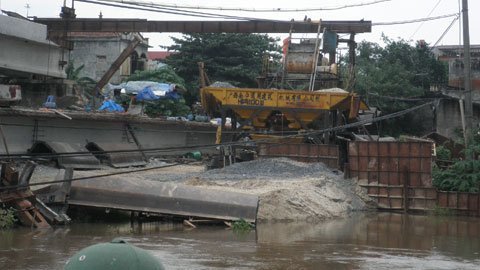 Chiếc cầu phao ngay bên cạnh cầu Hòa Viên đang xây. |