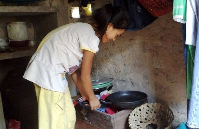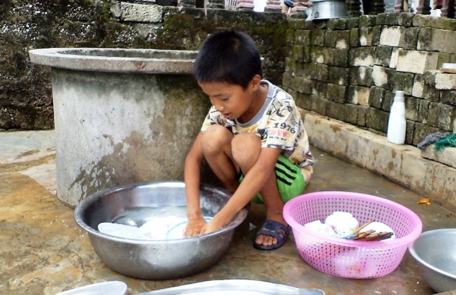 Vừa trò chuyện với chúng tôi một lát, Cảnh đã chạy vội ra sân còng lưng bê xô nước vào để rửa chén bát. Hai chị em loay hoay chế biến “thực đơn” cho bữa trưa gồm 1 bó rau khoai và 2 con cá trích.