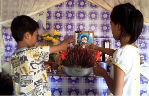 Nhờ người chỉ dẫn, chúng tôi tìm đến nhà khi cả 3 anh em vừa trở về từ cảng cá. Trần Văn Lam vừa qua tuổi 20 nhưng đã đen xạm và khắc khổ như một lão ngư luống tuổi. Mở cánh cửa cũ nát để mời khách vào nhà, Lam vội kéo tấm màn che bàn thờ bố lại.