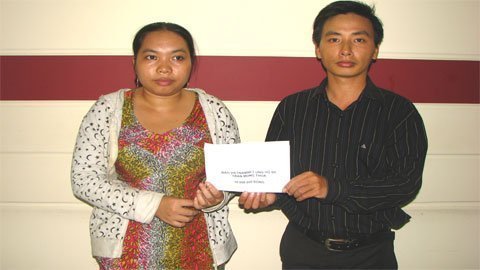| Đại diện Báo VietNamNet trao tiền bạn đọc ủng hộ cho chị Phạm Thị Thu mẹ bé Thoa |