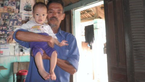 | Ông ôm cháu nhỏ bệnh tim và hát những lời ru buồn rầu: “Cây khô xuống nước cũng khô/Phận nghèo đi tới nơi mô cũng nghèo”. |