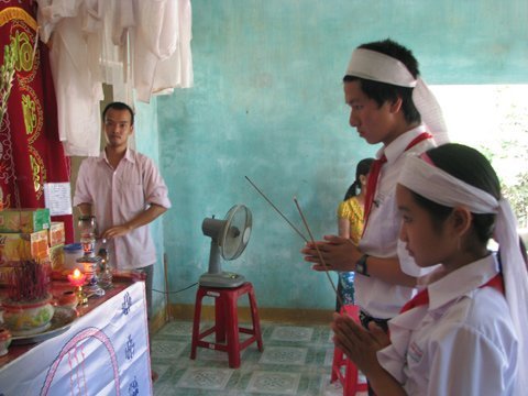 Tôi bước vào nhà, đập vào mắt tôi là hình ảnh hai anh em Trung – Hiếu đang ôm nhau ngồi khóc trước hai bàn thờ nghi ngút khói hương. Trong căn nhà hoang lạnh với hai bàn thờ chỉ trong vòng một tháng đã khiến người dân nơi làng nghèo khó này ai cũng rơi nước mắt.