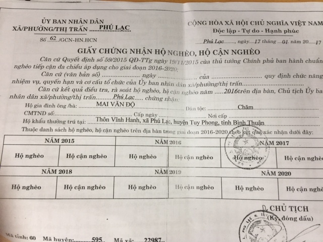 Giấy chứng nhận hộ nghèo của gia đình chị Bé Hai