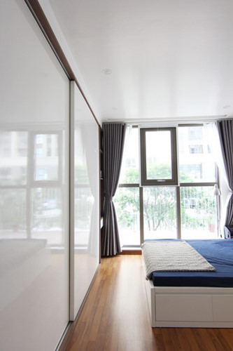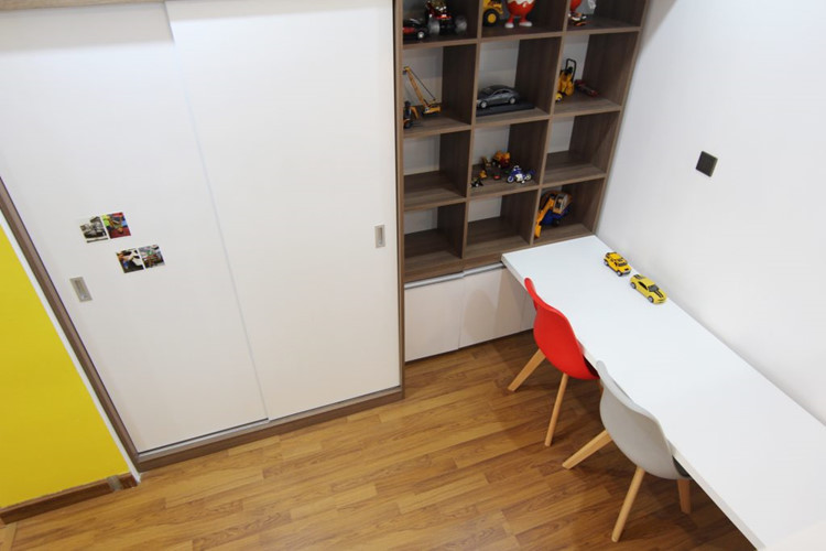 Tủ gỗ công nghiệp kết hợp với cánh cửa lùa cỡ lớn giúp căn hộ vừa gọn gàng lại tối đa hóa được không gian lưu trữ đồ dùng.