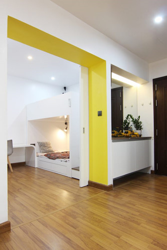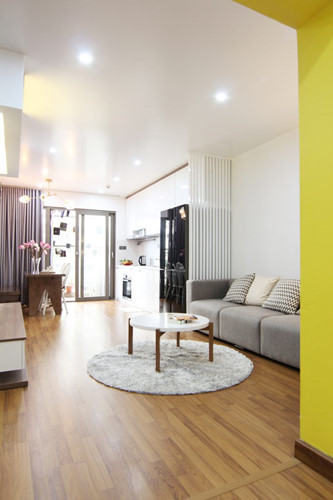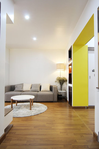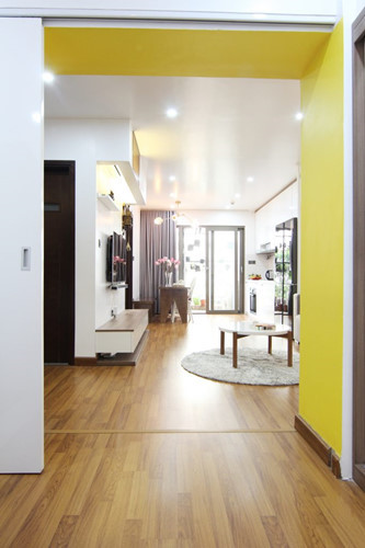 Dành cho gia đình trẻ, nên căn phòng cần có những gam màu năng động. Và màu vàng được lựa chọn làm điểm nhấn.