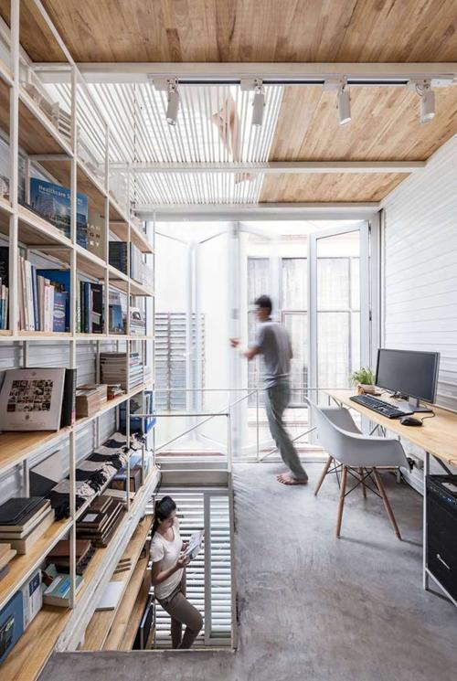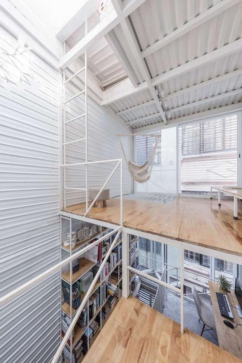 Vật liệu được sử dụng để xây dựng văn phòng chủ yếu là sắt, tấm kim loại và thép sơn trắng. Điều này không chỉ giúp ngôi nhà thoáng rộng hơn, mà còn tạo hiệu ứng phản chiếu, giúp lan tỏa ánh sáng khắp các tầng và tầng lửng. Các tầng lửng được làm bằng gỗ cao su kết hợp với tấm kim loại màu trắng, tạo sự tương phản giữa hiện đại và mộc mạc.
