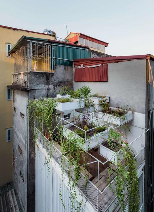 Các chậu cây trên tầng thượng của ngôi nhà sử dụng hệ thống tưới tự động được làm bằng vật liệu nhẹ với chiều cao và kích thước khác nhau. Các chậu cây giúp tạo bóng mát và là nơi thư giãn rất tuyệt vời.