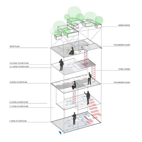 Ngôi nhà bao gồm 2 tầng chính, giữa là tầng lửng với độ cao khác nhau. Mọi không gian trong nhà đều kết nối với nhau và có độ thông thoáng, làm tăng sự tương tác, những người làm việc ở trong nhà có thể nhìn thấy nhau từ mọi tầng.