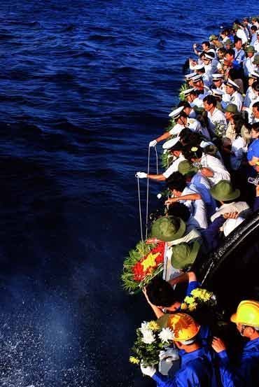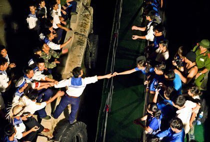 | Phút chia tay trên cầu cảng Trường Sa, mảnh đất thiêng liêng của Tổ quốc Việt Nam. Ảnh: Vũ Ngọc Hoàng |
