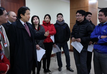 Thứ trưởng Trần Anh Tuấn (thứ ba bên trái) hỏi han những thí sinh vừa hoàn thành đợt thi trực tuyến đầu tiên