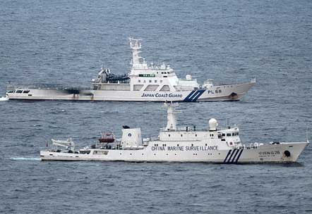 | Tàu Nhật đối đầu tàu Trung Quốc. Ảnh: AP |
