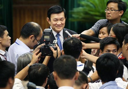 | Chủ tịch nước Trương Tấn Sang trong vòng vây báo chí sau khi được Quốc hội bầu, tháng 7/2011. Ảnh: Lê Anh Dũng |