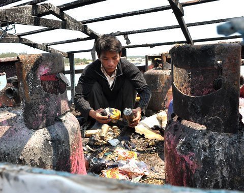 | Cabin tàu cá của ngư dân Bùi Văn Phải bị bắn cháy ở vùng biển Hoàng Sa ngày 20/3. Ảnh: VnExpress |