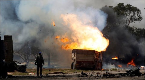 | Xe cộ của lực lượng Qaddafi bị đốt chay sau cuộc không kích của lực