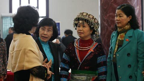 Các nữ ĐBQH tranh thủ trò chuyện, giao lưu trước giờ khai mạc. Đây là kỳ họp cuối cùng của nhiệm kỳ khóa XII. Ảnh: Lê Anh Dũng |