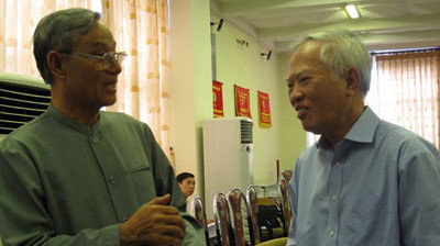 Nguyên Phó Thủ tướng Vũ Khoan và TS Nguyễn Nhã trao đổi tại hội thảo. Ảnh: Phương Loan