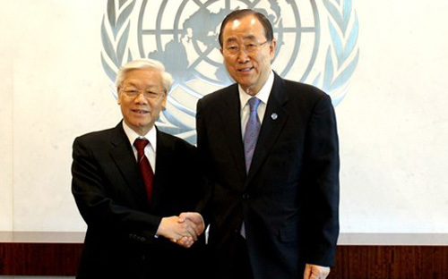 Sáng 10/7 (tối cùng ngày giờ VN), Tổng Bí thư Nguyễn Phú Trọng đã đến thăm trụ sở Liên Hiệp Quốc tại New York và hội kiến với Tổng Thư ký LHQ Ban Ki Moon.