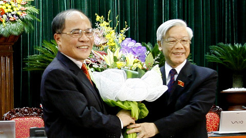 | Tân Chủ tịch nước Trương Tấn Sang nhận hoa chúc mừng của Thủ tướng Nguyễn Tấn Dũng. Ảnh: Lê Anh Dũng |