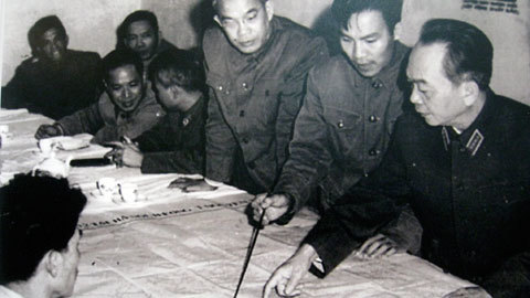 | Đại tướng Võ Nguyên Giáp duyệt phương án đánh B52 của Mỹ tập kích vào Hà Nội. Ảnh triển lãm. |