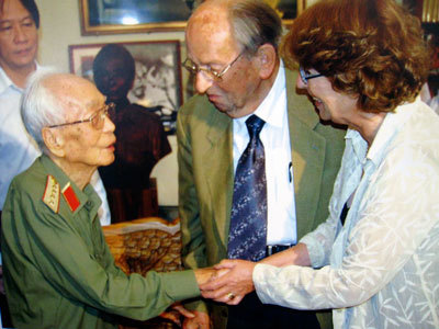 | Tháng 9/2007, ông Raymond Aubrac, người bạn thân thiết của nhân dân Việt Nam cùng con gái Elizabeth, con nuôi của Chủ tịch Hồ Chí Minh thăm Việt Nam. Ông Aubrac cùng con gái đến thăm Đại tướng Võ Nguyên Giáp ngày 2/9/2007. Ảnh triển lãm. |