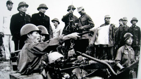 | Đại tướng Tổng tư lệnh Võ Nguyên Giáp và Trung tướng Song Hào, Chủ nhiệm Tổng cục Chính trị quân đội nhân dân Việt Nam (bên trái Đại tướng, đứng thứ 4 từ trái sang) quan sát Đại đội 6 Trung đoàn 233, Đoàn Cao xạ Đống Đa huấn luyện (Tết Mậu thân năm 1968). Ảnh triển lãm. |