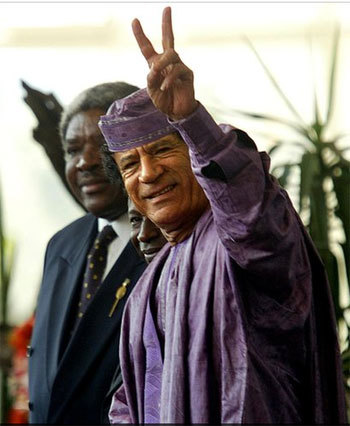 | Cuối những năm 1990, lãnh đạo Libya thừa nhận rằng, chủ nghĩa thuần Ảrập đã sụp đổ, ông tự sửa đổi mình thành một nhà quán quân của châu Phi. Phong cách thời trang của ông cũng trở nên rực rỡ hơn. |