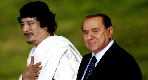 | Gaddafi trở thành vị khách thường xuyên viếng thăm. Một tờ báo Italia mô tả ông và Thủ tướng Silvio Berlusconi như "hai người đàn ông với mái tóc đen và khuôn mặt đầy nếp nhăn do phẫu thuật thẩm mỹ quá nhiều". |